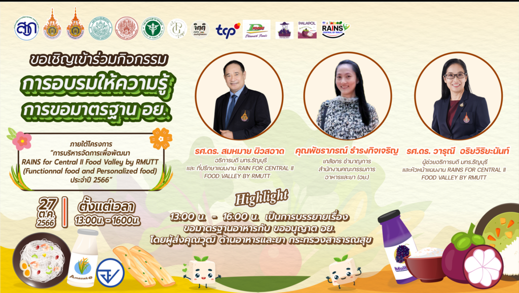 กิจกรรมอบรมให้ความรู้การขอมาตรฐานอย. ในหัวข้อการบรรยาย เรื่อง “การขอมาตรฐานอาหารกับการขออนุญาต อย. โดย คุณพัชราภรณ์ ธำรงกิจเจริญ เภสัชกรชำนาญการ สำนักงานคณะกรรมการอาหารและยา (อย.) รายละเอียดเพิ่มเตืม