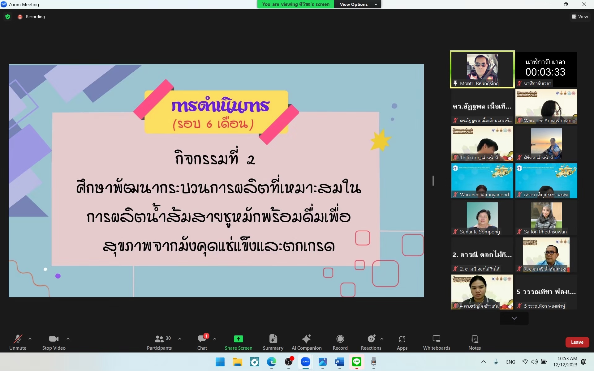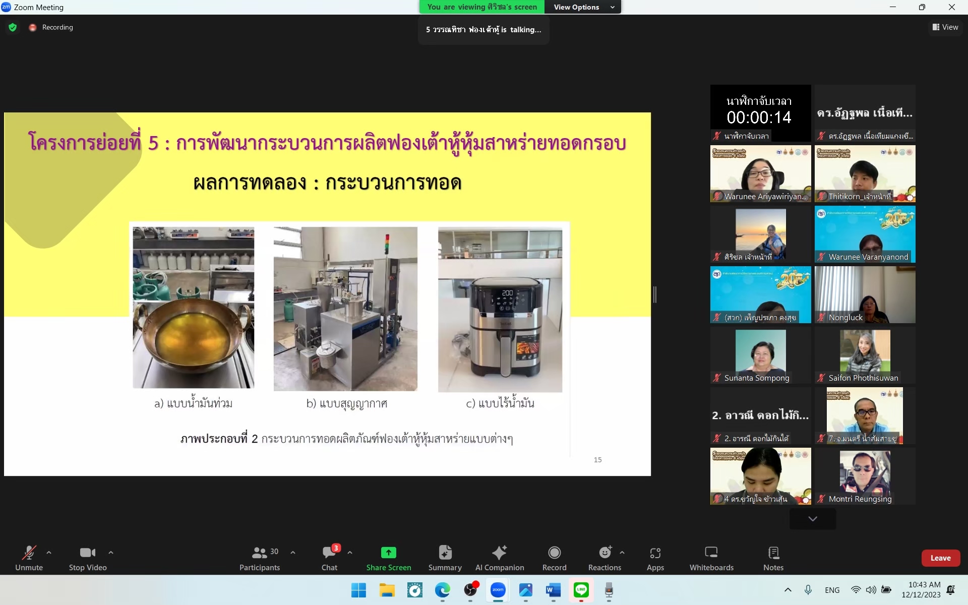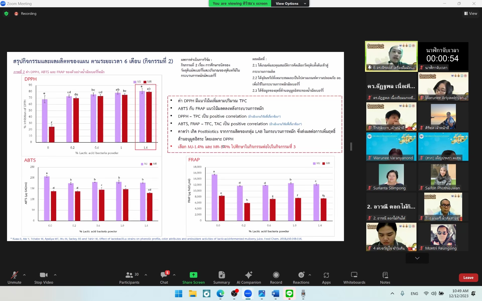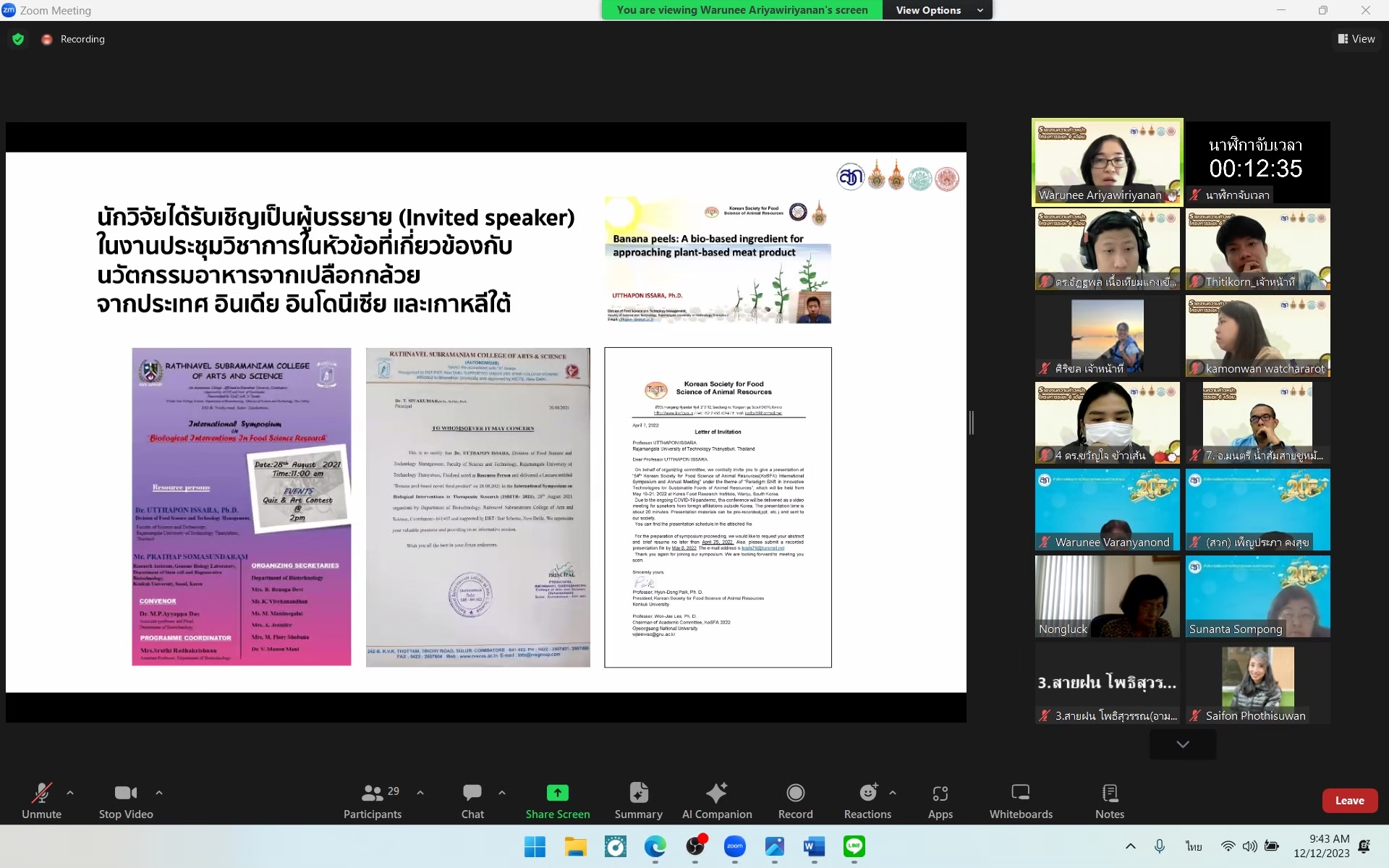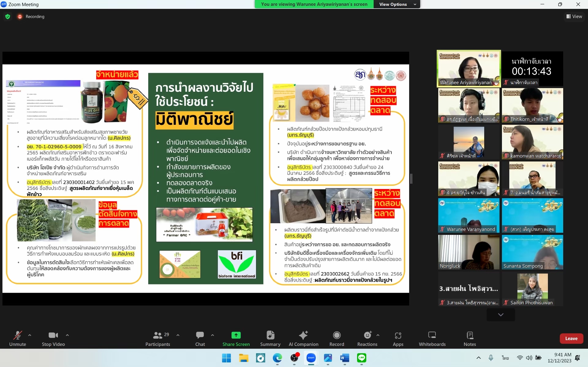 รศ.ดร. วารุณี อริยวิริยะ ผู้ช่วยอธิการบดี มหาวิทยาลัยเทคโนโลยีราชมงคลธัญบุรี หัวหน้าแผนงานวิจัย โครงการ การบริหารจัดการเพื่อพัฒนา RAINS for Central II Food Valley by RUMTT (Functional food and Personalized food) ประจำปี 2566 ได้เข้าร่วมนำเสนอรายงานความก้าวหน้าครั้งที่ 2 (6 เดือน) ต่อคณะผู้ทรงคุณวุฒิฯ ที่สำนักงานพัฒนาการวิจัยการเกษตร (องค์การมหาชน) หรือ สวก. ได้จัดประชุมขึ้น โดยการจัดประชุมครั้งนี้เป็นการติดตามความก้าวหน้าของโครงการแผน และโครงการย่อยทั้ง 8 โครงการเพื่อนำข้อเสนอแนะจากท่านผู้ทรงคุณวุฒิฯ ไปปรับปรุงแก้ไขให้โครงการบรรลุเป้าหมาย และวัตถุประสงค์ต่อไป เมื่อวันอังคารที่ 12 ธันวาคม 2566 เวลา 09.30 – 12.00 น. ผ่านระบบสื่ออิเล็กทรอนิกส์ (Zoom Video Conference)